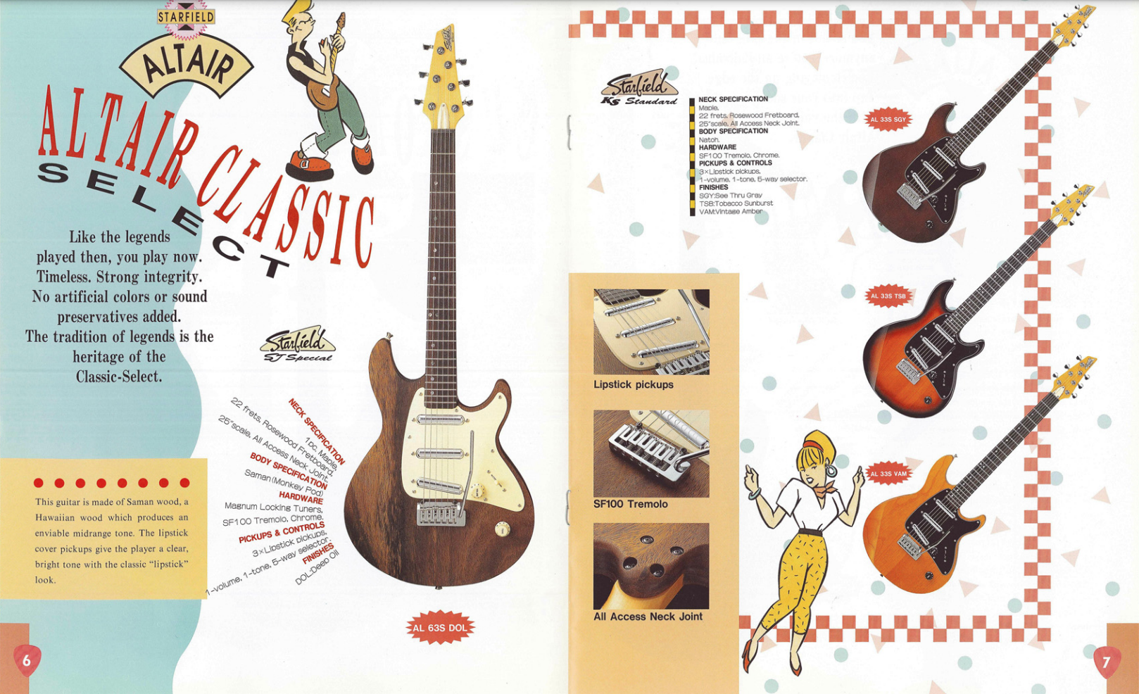 Dit specifieke exemplaar betreft het zeldzame topmodel uit de “Altair Classic Select serie” en heeft de volgende specificaties: Body uit Saman/Monkey Pod (volgens de folder zorgt deze hawaiaanse houtsoort voor “enviable mids”. De slanke C shape hals is uit één stuk kwartiersgezaagd rock maple, de toets is uit Indisch palisander en heeft een Gibson radius van 12”.